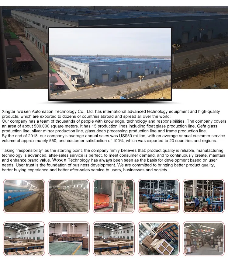 Xingtai wosen Automation Technology Co., Ltd. has international advanced technology equipment and high-quality products, which are exported to dozens of countries abroad and spread all over the world;Our company has a team of thousands of people with knowledge, technology and responsibilities. The company covers an area of about 500,000 square meters. It has 15 production lines including float glass production line, Gefa glass production line, silver mirror production line, glass deep processing production line and frame production line.Cultural conceptEnterprise mission: the latest technology, the best products, the most beautiful service.Entrepreneurship: Only accidents are not impossible.Business philosophy: think about what you want, know what you need, create something for you, and help you succeed.Development philosophy: first strengthen, then expand, and maintain sustainable development.Business advantage1. Have rich experience2. Have a strong independent research team3. Have a professional sales team4. Have perfect after-sales service guaranteeOur company owns products: LED intelligent anti-fog mirror, glass bathroom, glass partition and other glass and mirror products and various ceramic tiles. Our company enjoys a good reputation in the domestic market. In 2016, the company established the international marketing department of products, vigorously explored foreign markets, and established a complete foreign trade committee for this purpose.We are confident that we can serve every customer and let you buy safe, comfortable and quality products.foreign markets, and established a complete foreign trade committee for this purpose.